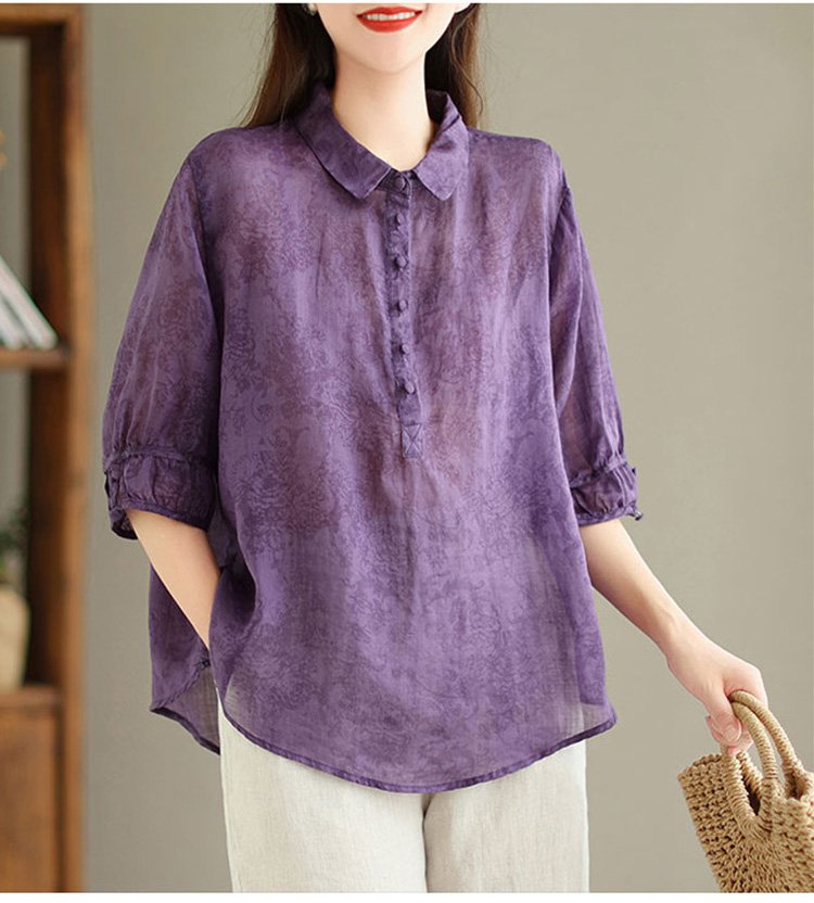 여성 벌룬 소매 면마 블라우스